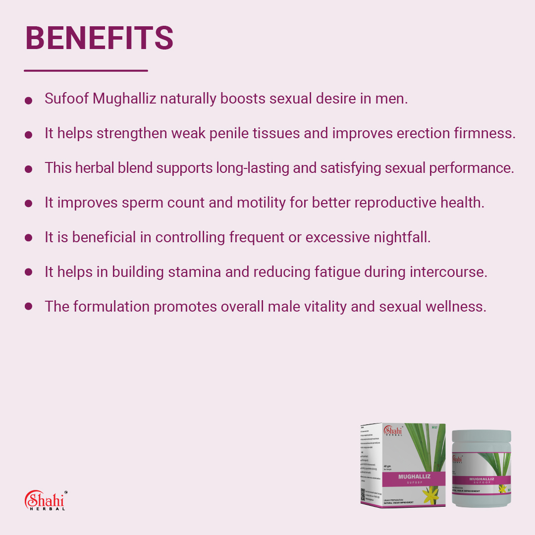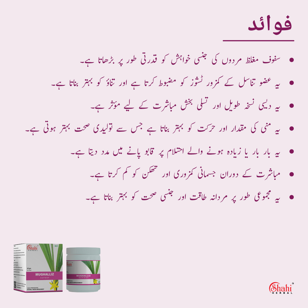 If you’re looking for a natural and effective way to reclaim your strength, performance, and desire, Sufoof Mughalliz is your ideal herbal companion. With regular use and proper care, it supports complete male wellness and helps you feel confident and revitalized again.